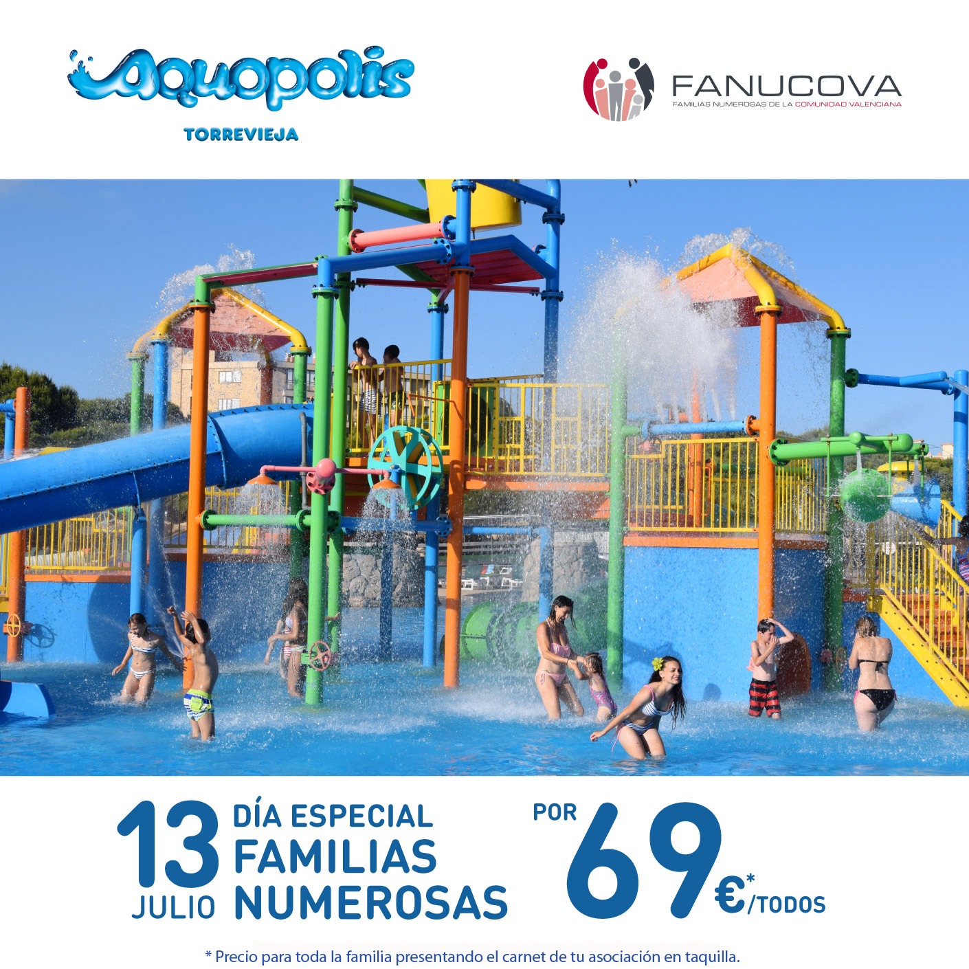 ¡Queridas familias llega el verano y el calor y qué mejor forma de disfrutarlo y combatirlo que en AQUOPOLIS! Un año más y gracias al convenio de colaboración entre FANUCOVA y el parque acuático de AQUOPOLIS las familias numerosas asociadas podrán disfrutar el próximo Sábado 13 de julio de un día en familia a un precio  muy reducido. (Tanto en el centro de Cullera como en el de Torrevieja)
