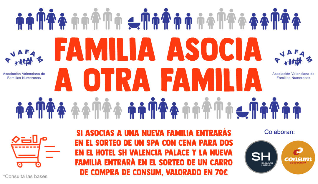 Iniciamos la Campaña de captación de socios porque somos conscientes de que la unión hace la fuerza. Hemos preparado dos premios espectaculares para todos aquellos que participen. Por cada familia nueva que se asocie gracias a un socio de AVAFAM entraréis en un sorteo de un SPA para dos + cena en el Hotel SH Valencia Palace*****. Y las nuevas familias que se asocien de parte de otra, entrarán en el sorteo de un carro de Consum valorado en 70€. ¿A qué estás esperando para contárselo a todos tus amigos?