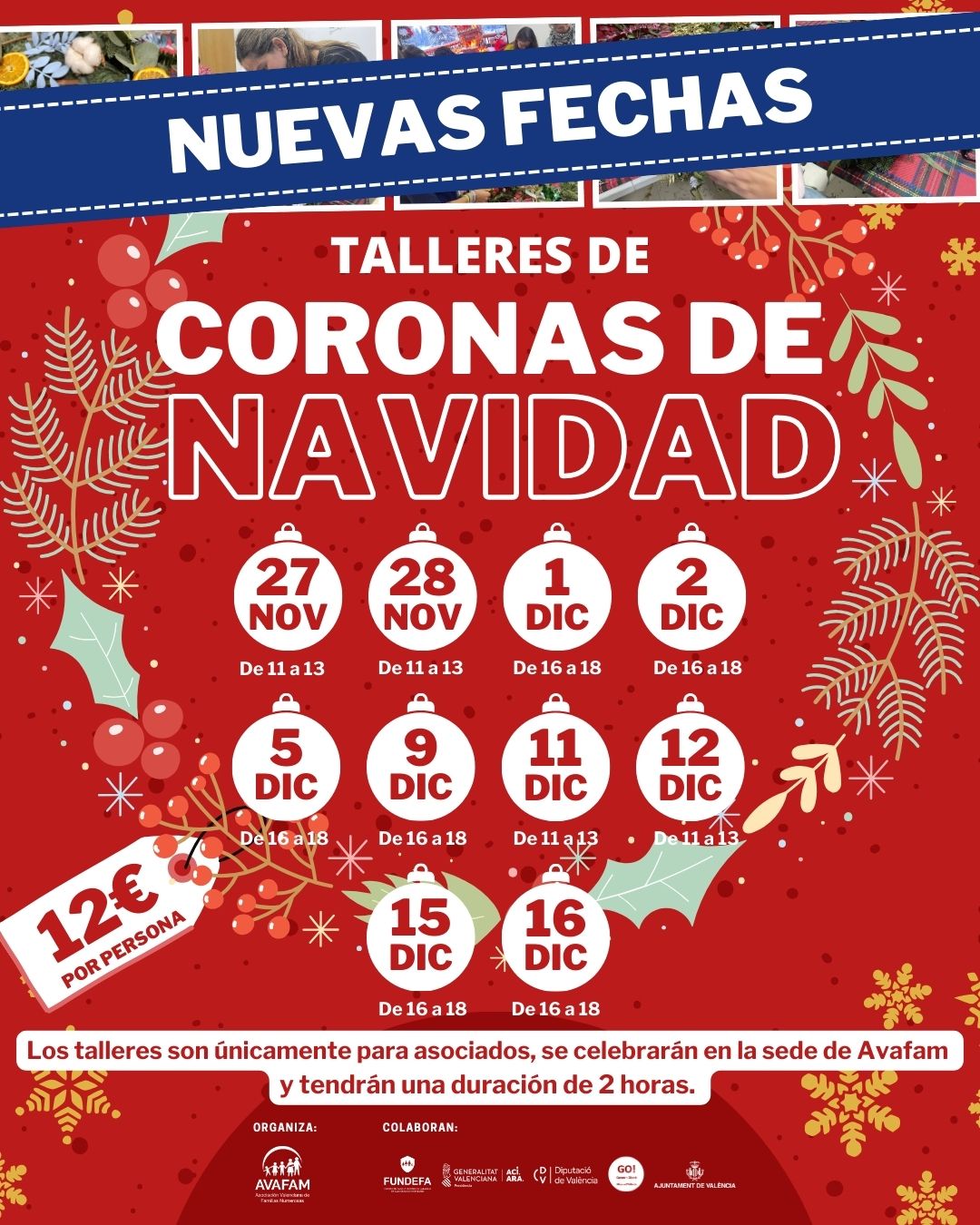 ¡No te quedes sin tu corona! Apúntate a los nuevos talleres de coronas de Navidad de Avafam. Selecciona la fecha que mejor se adapte a ti y ven a crear tu corona de Navidad.