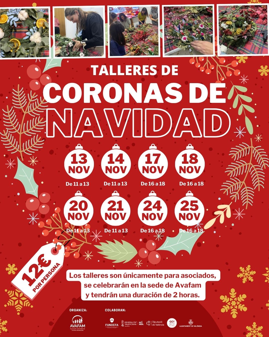 Ya están aquí los talleres de coronas de Navidad 2025, para que vayas preparando tu casa para estas fechas tan señaladas. Elige el día que mejor te venga y ven a pasar un rato muy agradable con nosotros en la sede de Avafam. Al terminar el taller llévate tu corona para disfrutarla y presumir de ella.